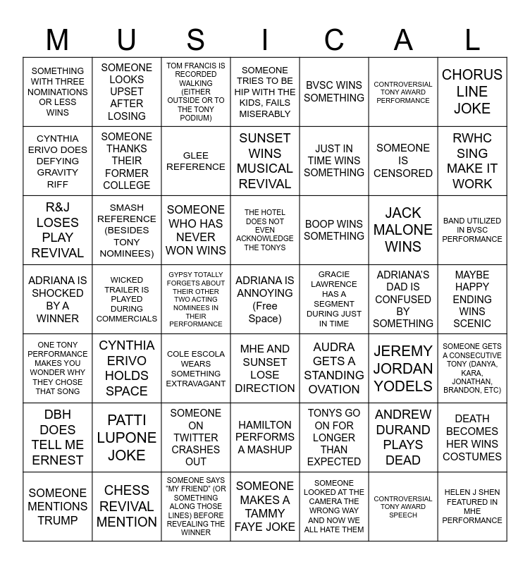 This bingo card has a free space and 48 words: TONYS GO ON FOR LONGER THAN EXPECTED, SOMEONE IS CENSORED, SOMEONE MAKES A TAMMY FAYE JOKE, WICKED TRAILER IS PLAYED DURING COMMERCIALS, SOMEONE WHO HAS NEVER WON WINS, MAYBE HAPPY ENDING WINS SCENIC, SOMEONE LOOKS UPSET AFTER LOSING, CHESS REVIVAL MENTION, CONTROVERSIAL TONY AWARD PERFORMANCE, MHE AND SUNSET LOSE DIRECTION, CHORUS LINE JOKE, SOMEONE TRIES TO BE HIP WITH THE KIDS, FAILS MISERABLY, JACK MALONE WINS, BOOP WINS SOMETHING, DBH DOES TELL ME ERNEST, ADRIANA’S DAD IS CONFUSED BY SOMETHING, CYNTHIA ERIVO DOES DEFYING GRAVITY RIFF, RWHC SING MAKE IT WORK, ANDREW DURAND PLAYS DEAD, BVSC WINS SOMETHING, JUST IN TIME WINS SOMETHING, GYPSY TOTALLY FORGETS ABOUT THEIR OTHER TWO ACTING NOMINEES IN THEIR PERFORMANCE, SOMETHING WITH THREE NOMINATIONS OR LESS WINS, SOMEONE THANKS THEIR FORMER COLLEGE, DEATH BECOMES HER WINS COSTUMES, GLEE REFERENCE, BAND UTILIZED IN BVSC PERFORMANCE, SOMEONE MENTIONS TRUMP, THE HOTEL DOES NOT EVEN ACKNOWLEDGE THE TONYS, SMASH REFERENCE (BESIDES TONY NOMINEES), CONTROVERSIAL TONY AWARD SPEECH, GRACIE LAWRENCE HAS A SEGMENT DURING JUST IN TIME, SOMEONE GETS A CONSECUTIVE TONY (DANYA, KARA, JONATHAN, BRANDON, ETC), PATTI LUPONE JOKE, ADRIANA IS SHOCKED BY A WINNER, AUDRA GETS A STANDING OVATION, JEREMY JORDAN YODELS, R&J LOSES PLAY REVIVAL, COLE ESCOLA WEARS SOMETHING EXTRAVAGANT, SOMEONE ON TWITTER CRASHES OUT, ONE TONY PERFORMANCE MAKES YOU WONDER WHY THEY CHOSE THAT SONG, HELEN J SHEN FEATURED IN MHE PERFORMANCE, TOM FRANCIS IS RECORDED WALKING (EITHER OUTSIDE OR TO THE TONY PODIUM), SOMEONE SAYS “MY FRIEND” (OR SOMETHING ALONG THOSE LINES) BEFORE REVEALING THE WINNER, SUNSET WINS MUSICAL REVIVAL, HAMILTON PERFORMS A MASHUP, CYNTHIA ERIVO HOLDS SPACE and SOMEONE LOOKED AT THE CAMERA THE WRONG WAY AND NOW WE ALL HATE THEM.