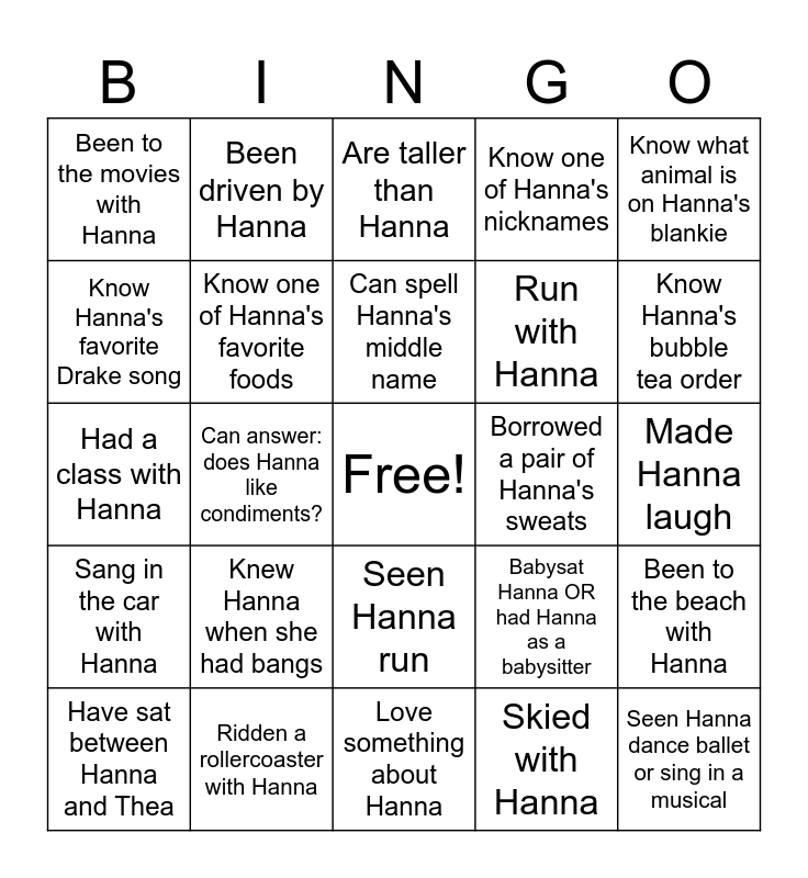 This bingo card has a free space and 24 words: Knew Hanna when she had bangs, Ridden a rollercoaster with Hanna, Can spell Hanna's middle name, Have sat between Hanna and Thea, Know what animal is on Hanna's blankie, Been to the movies with Hanna, Know Hanna's favorite Drake song, Been driven by Hanna, Borrowed a pair of Hanna's sweats, Seen Hanna run, Run with Hanna, Had a class with Hanna, Babysat Hanna OR had Hanna as a babysitter, Been to the beach with Hanna, Know one of Hanna's favorite foods, Skied with Hanna, Made Hanna laugh, Are taller than Hanna, Know Hanna's bubble tea order, Can answer: does Hanna like condiments?, Seen Hanna dance ballet or sing in a musical, Sang in the car with Hanna, Know one of Hanna's nicknames and Love something about Hanna.