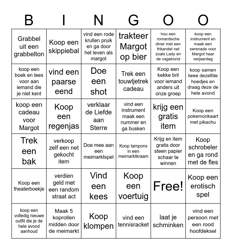 This bingo card has 37 words: Free!, Koop een voertuig, laat je schminken, koop een boek en lees voor aan iemand die je niet kent, verkoop zelf een net gekocht item, krijg een gratis item, vind een paarse eend, vind een tennisracket, hou een romantische diner met een frikandel net zoals Lady en de vagebond, koop een volledig nieuwe outfit die je de hele avond aanhoud, koop samen twee dezelfde hoedjes en draag deze de hele avond, trakteer Margot op bier, koop een cadeau voor Margot, verklaar de Liefde aan Sterre, koop een instrument en maak een serenade voor Margot haar verjaardag, vind een instrument maak een nummer en ga busken, verdien geld met een random straat act, vind een rode krullen pruik en ga door het leven als margot, Koop een pokemonkaart met pikachu, Koop een regenjas, Grabbel uit een grabbelton, Trek een touwtjetrek cadeau, Doe mee aan een meimarktspel, Krijg en item gratis door steen papier schaar te winnen, Maak 5 koprollen midden door de meimarkt, Koop schrobeler en ga rond met de fles, Koop een skippiebal, Koop klompen, Koop een erotisch spel, Vind een kees, Koop een item waar je uit kan drinken en drink hier de rest van de avond uit, Koop tampons in een meimarktkraam, Koop een kekke bril voor iemand anders uit onze groep, Koop een theaterboekje, Trek een bak, Doe een shot and vind een persoon met een rood hoofdeksel.