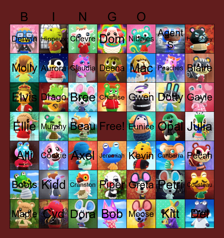 This bingo card has 292 images, a free space and 296 words: Ace, Admiral, Agent S, Agnes, Al, Alfonso, Alice, Alli, Amelia, Anabelle, Anchovy, Angus, Anicotti, Ankha, Annalisa, Annalise, Antonio, Apollo, Apple, Astrid, Audie, Aurora, Ava, Avery, Axel, Azalea, Baabara, Bam, Bangle, Barold, Bea, Beardo, Beau, Becky, Bella, Benedict, Benjamin, Bertha, Bettina, Bianca, Biff, Big Top, Bill, Billy, Biskit, Bitty, Blaire, Blanche, Bluebear, Bob, Bonbon, Bones, Boomer, Boone, Boots, Boris, Boyd, Bree, Broccolo, Broffina, Bruce, Bubbles, Buck, Bud, Bunnie, Butch, Buzz, Cally, Camofrog, Canberra, Candi, Carmen, Caroline, Carrie, Cashmere, Celia, Cephalobot, Cesar, Chabwick, Chadder, Charlise, Cheri, Cherry, Chester, Chevre, Chief, Chops, Chow, Chrissy, Claude, Claudia, Clay, Cleo, Clyde, Coach, Cobb, Coco, Cole, Colton, Cookie, Cousteau, Cranston, Croque, Cube, Curlos, Curly, Curt, Cyd, Cyrano, Daisy, Deena, Deirdre, Del, Deli, Derwin, Diana, Diva, Dizzy, Dobie, Doc, Dom, Dora, Dotty, Drago, Drift, Ed, Egbert, Elise, Ellie, Elmer, Eloise, Elvis, Erik, Eugene, Eunice, Faith, Fang, Fauna, Felicity, Filbert, Flip, Flo, Flora, Flurry, Francine, Frank, Freckles, Frett, Freya, Friga, Frita, Frobert, Fuchsia, Gabi, Gala, Gaston, Gayle, Genji, Gigi, Gladys, Goldie, Gonzo, Goose, Graham, Greta, Grizzly, Groucho, Gruff, Gwen, Hamlet, Hamphrey, Hans, Harry, Hazel, Henry, Hippeux, Hopkins, Hopper, Hornsby, Huck, Hugh, Iggly, Ike, Ione, Jacob, Jacques, Jambette, Jay, Jeremiah, Jitters, Joey, Judy, Julia, Julian, June, Kabuki, Katt, Keaton, Ken, Kevin, Kid Cat, Kidd, Kiki, Kitt, Kitty, Klaus, Knox, Kody, Kyle, Leonardo, Leopold, Lily, Limberg, Lionel, Lobo, Lolly, Lopez, Louie, Lucha, Lucky, Lucy, Lyman, Mac, Maddie, Maelle, Maggie, Mallary, Maple, Marcel, Marcie, Margie, Marina, Marlo, Marshal, Mathilda, Megan, Melba, Merengue, Merry, Midge, Mint, Mira, Miranda, Mitzi, Moe, Molly, Monique, Monty, Moose, Mott, Muffy, Murphy, Nan, Nana, Naomi, Nate, Nibbles, Norma, O'Hare, Octavian, Olaf, Olive, Olivia, Opal, Ozzie, Pancetti, Pango, Paolo, Papi, Pashmina, Pate, Patty, Paula, Peaches, Peanut, Pecan, Peck, Peewee, Peggy, Pekoe, Penelope, Petri, Phil, Phoebe, Pierce, Pietro, Pinky, Piper, Pippy, Plucky, Pompom, Poncho, Poppy, Portia, Prince and Puck.