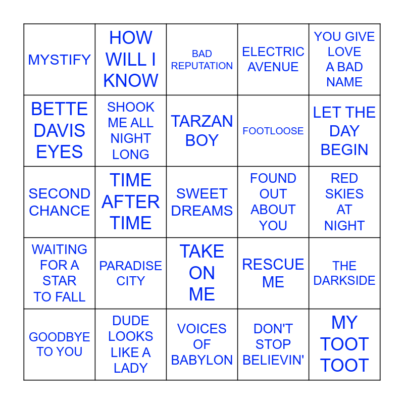 This bingo card has 40 words: FANTASY GIRL, SECOND CHANCE, POISON ARROW, SHOOK ME ALL NIGHT LONG, DUDE LOOKS LIKE A LADY, TAKE ON ME, TARZAN BOY, WE DIDN'T START THE FIRE, YOU GIVE LOVE A BAD NAME, WAITING FOR A STAR TO FALL, TIME AFTER TIME, ELECTRIC AVENUE, SWEET DREAMS, RED SKIES AT NIGHT, FOUND OUT ABOUT YOU, PARADISE CITY, ROCKIN' AT MIDNIGHT, MYSTIFY, SOMEBODYS BABY, BAD REPUTATION, THE DARKSIDE, DON'T STOP BELIEVIN', FOOTLOOSE, BETTE DAVIS EYES, THRILLER, DON'T TELL ME YOU LOVE ME, BACK ON THE CHAIN GANG, UNDER PRESSURE, MY TOOT TOOT, TALKING IN YOUR SLEEP, LIMELIGHT, GOODBYE TO YOU, TAINTED LOVE, RESCUE ME, LET THE DAY BEGIN, VOICES OF BABYLON, DREAMS, LET'S GO, HOW WILL I KNOW and GIMME ALL YOUR LOVIN.