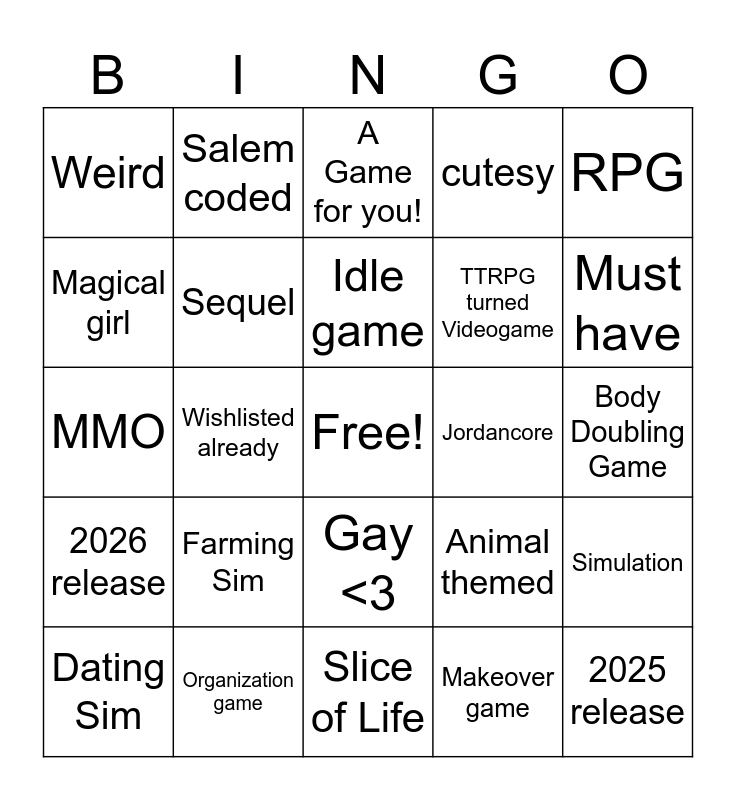 This bingo card has a free space and 24 words: Farming Sim, Organization game, Idle game, Dating Sim, RPG, Weird, Magical girl, Salem coded, Jordancore, Gay <3, TTRPG turned Videogame, MMO, Animal themed, Simulation, Sequel, Makeover game, Body Doubling Game, A Game for you!, Must have, Wishlisted already, 2025 release, 2026 release, cutesy and Slice of Life.