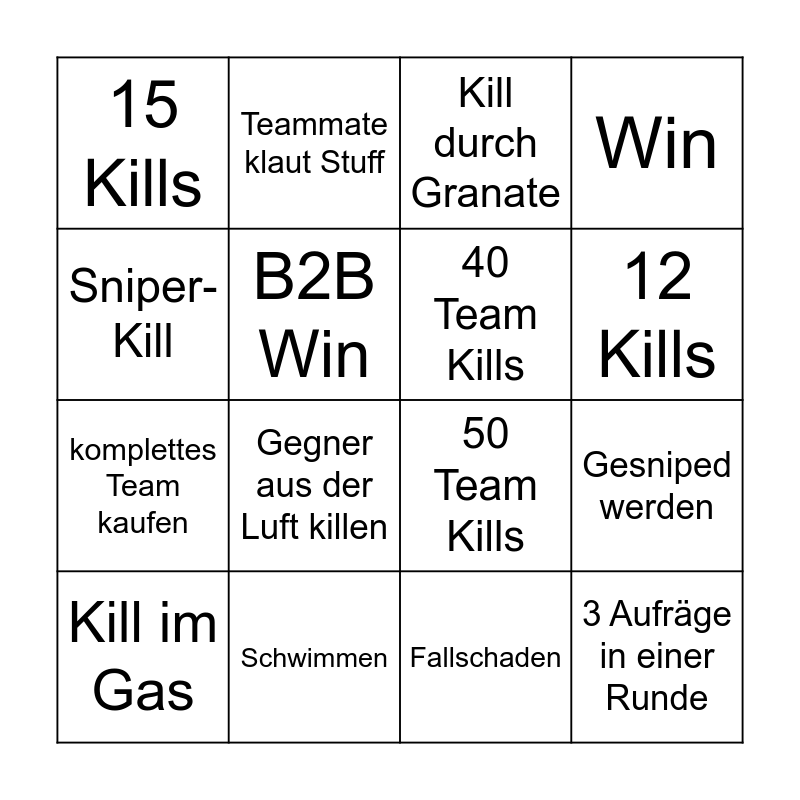 This bingo card has 16 words: Kill im Gas, Schwimmen, Kill durch Granate, Win, Sniper-Kill, Teammate klaut Stuff, 50 Team Kills, Gesniped werden, 15 Kills, B2B Win, Fallschaden, 12 Kills, komplettes Team kaufen, Gegner aus der Luft killen, 40 Team Kills and 3 Aufräge in einer Runde.