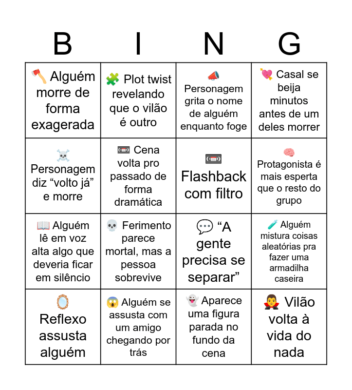 This bingo card has 34 words: 🔪 Personagem transa e morre logo depois, 🏃♀️ Alguém tropeça enquanto foge, 📖 Grupo encontra diário antigo revelador, 🌲 Adolescentes sozinhos na floresta à noite, 🧛♂️ Vilão volta à vida do nada, 📼 Flashback com filtro, ☠️ Personagem diz “volto já” e morre, 🕯️ Luz começa a falhar no momento errado, 🧩 Plot twist revelando que o vilão é outro, 🕸️ Casa abandonada cheia de pistas, 🧠 Protagonista é mais esperta que o resto do grupo, 📣 Personagem grita o nome de alguém enquanto foge, 🔪 Alguém é esfaqueado do nada, 📱 Telefone toca bem na hora do susto, 😱 Alguém se assusta com um amigo chegando por trás, 💀 Ferimento parece mortal, mas a pessoa sobrevive, 🎯 Plano genial dá errado em 2 segundos, 💬 “A gente precisa se separar”, 🩸 Alguém se lambuza de sangue por estratégia, 🚨 A polícia não ajuda em nada, 🚪 Porta tranca sozinha, 🧠 Personagem tem uma ideia milagrosa de última hora, 🪓 Alguém morre de forma exagerada, 👻 Aparece uma figura parada no fundo da cena, 🔊 Barulho estranho leva todo mundo a investigar, 🪞 Reflexo assusta alguém, 💘 Casal se beija minutos antes de um deles morrer, 🧙♀️ Alguém diz “é só uma lenda” e obviamente está errado, 📖 Alguém lê em voz alta algo que deveria ficar em silêncio, 📼 Cena volta pro passado de forma dramática, 🪵 Alguém se esconde embaixo de uma mesa/cama achando que vai dar certo, 🧪 Alguém mistura coisas aleatórias pra fazer uma armadilha caseira, 🔥 O lugar pega fogo e ninguém consegue sair direito and 📣 Gritos de “CORRE!” ou “NÃO!” ecoando pela cena.