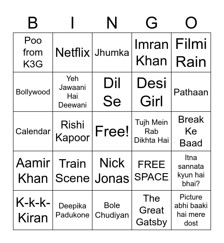 This bingo card has a free space and 25 words: Train Scene, Bole Chudiyan, Dil Se, K-k-k-Kiran, Filmi Rain, Poo from K3G, Bollywood, Netflix, Tujh Mein Rab Dikhta Hai, Nick Jonas, Desi Girl, Calendar, FREE SPACE, Itna sannata kyun hai bhai?, Yeh Jawaani Hai Deewani, Kriti Sanon, Break Ke Baad, Jhumka, Pathaan, Rishi Kapoor, Picture abhi baaki hai mere dost, Deepika Padukone, Aamir Khan, Imran Khan and The Great Gatsby.