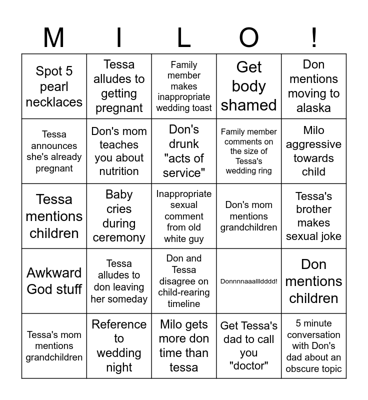 This bingo card has 25 words: Tessa alludes to don leaving her someday, Milo gets more don time than tessa, Don's drunk "acts of service", Tessa's mom mentions grandchildren, Don mentions moving to alaska, Spot 5 pearl necklaces, Tessa announces she's already pregnant, Tessa alludes to getting pregnant, Don's mom mentions grandchildren, Don and Tessa disagree on child-rearing timeline, Family member comments on the size of Tessa's wedding ring, Tessa mentions children, Donnnnaaallldddd!, Don mentions children, Don's mom teaches you about nutrition, 5 minute conversation with Don's dad about an obscure topic, Tessa's brother makes sexual joke, Family member makes inappropriate wedding toast, Milo aggressive towards child, Baby cries during ceremony, Inappropriate sexual comment from old white guy, Reference to wedding night, Awkward God stuff, Get body shamed and Get Tessa's dad to call you "doctor".