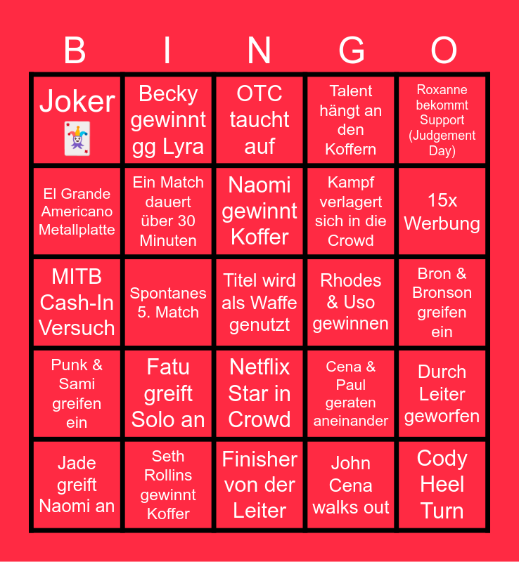 This bingo card has a free space and 24 words: Fatu greift Solo an, Seth Rollins gewinnt Koffer, Naomi gewinnt Koffer, Jade greift Naomi an, Roxanne bekommt Support (Judgement Day), Joker 🃏, El Grande Americano Metallplatte, Becky gewinnt gg Lyra, Rhodes & Uso gewinnen, Netflix Star in Crowd, Kampf verlagert sich in die Crowd, MITB Cash-In Versuch, Cena & Paul geraten aneinander, Durch Leiter geworfen, Ein Match dauert über 30 Minuten, John Cena walks out, Bron & Bronson greifen ein, OTC taucht auf, 15x Werbung, Spontanes 5. Match, Cody Heel Turn, Punk & Sami greifen ein, Talent hängt an den Koffern and Finisher von der Leiter.