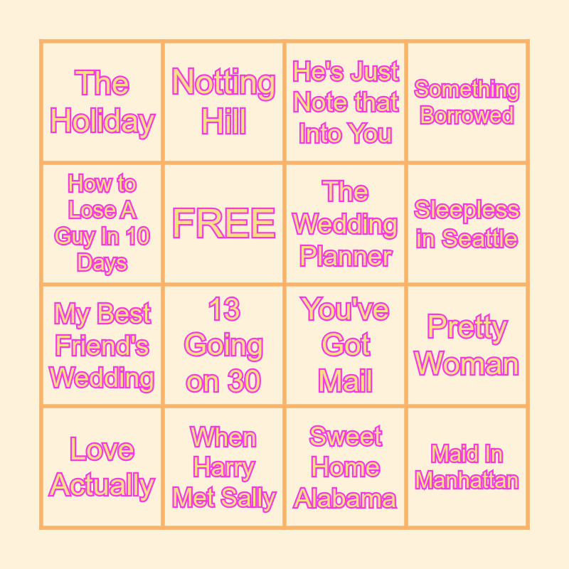 This bingo card has 16 words: When Harry Met Sally, Pretty Woman, He's Just Note that Into You, The Holiday, My Best Friend's Wedding, Notting Hill, You've Got Mail, Sweet Home Alabama, How to Lose A Guy In 10 Days, FREE, Love Actually, Something Borrowed, 13 Going on 30, Sleepless in Seattle, The Wedding Planner and Maid In Manhattan.