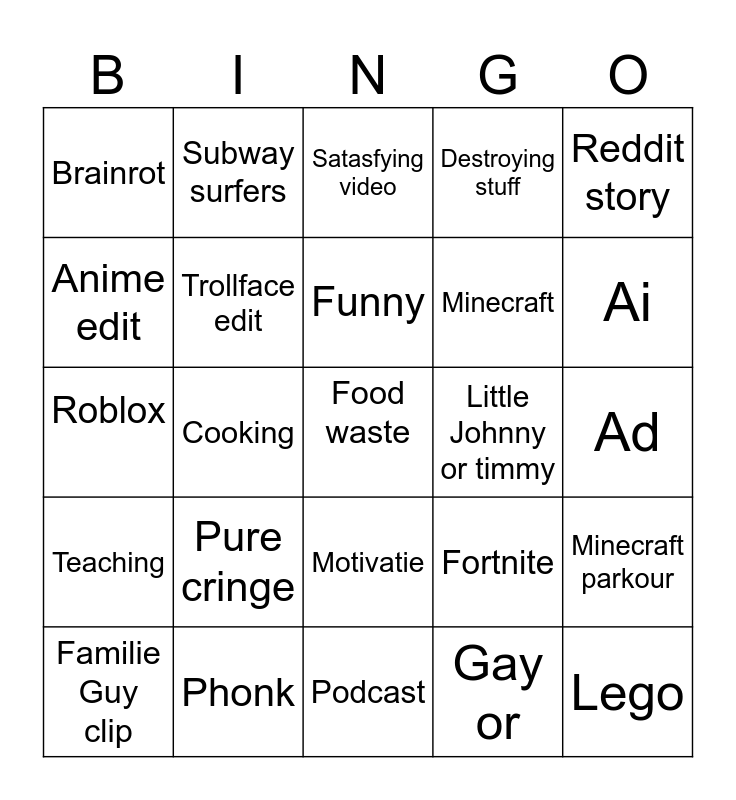 This bingo card has a free space and 24 words: Pure cringe, Phonk, Funny, Familie Guy clip, Reddit story, Brainrot, Anime edit, Subway surfers, Little Johnny or timmy, Motivatie, Minecraft, Roblox, Fortnite, Minecraft parkour, Trollface edit, Gay or, Ad, Satasfying video, Ai, Cooking, Lego, Teaching, Destroying stuff and Podcast.