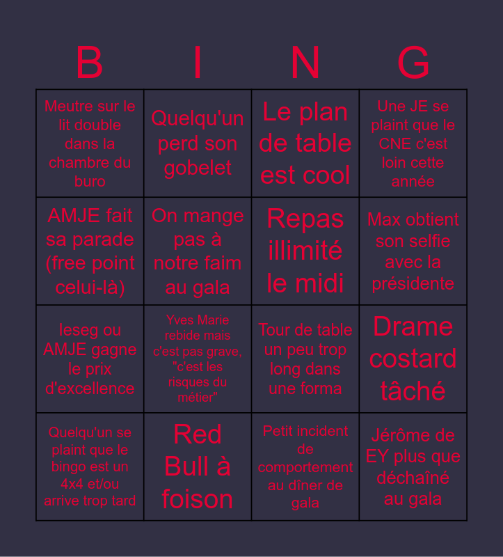 This bingo card has 16 words: Red Bull à foison, Drame costard tâché, Le plan de table est cool, Meutre sur le lit double dans la chambre du buro, Ieseg ou AMJE gagne le prix d'excellence, Quelqu'un perd son gobelet, Tour de table un peu trop long dans une forma, Petit incident de comportement au dîner de gala, AMJE fait sa parade (free point celui-là), On mange pas à notre faim au gala, Quelqu'un se plaint que le bingo est un 4x4 et/ou arrive trop tard, Une JE se plaint que le CNE c'est loin cette année, Yves Marie rebide mais c'est pas grave, "c'est les risques du métier", Max obtient son selfie avec la présidente, Repas illimité le midi and Jérôme de EY plus que déchaîné au gala.