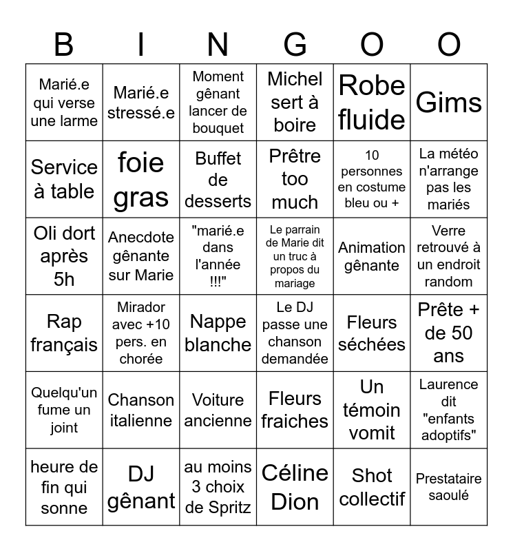 This bingo card has 36 words: Fleurs fraiches, Voiture ancienne, Céline Dion, Service à table, Rap français, Le parrain de Marie dit un truc à propos du mariage, foie gras, au moins 3 choix de Spritz, Robe fluide, Un témoin vomit, La météo n'arrange pas les mariés, Michel sert à boire, Laurence dit "enfants adoptifs", Anecdote gênante sur Marie, Prêtre too much, Marié.e qui verse une larme, Quelqu'un fume un joint, Animation gênante, Oli dort après 5h, Moment gênant lancer de bouquet, "marié.e dans l'année !!!", Mirador avec +10 pers. en chorée, Le DJ passe une chanson demandée, Nappe blanche, Fleurs séchées, Marié.e stressé.e, 10 personnes en costume bleu ou +, DJ gênant, Buffet de desserts, Gims, Prestataire saoulé, heure de fin qui sonne, Prête + de 50 ans, Verre retrouvé à un endroit random, Chanson italienne and Shot collectif.