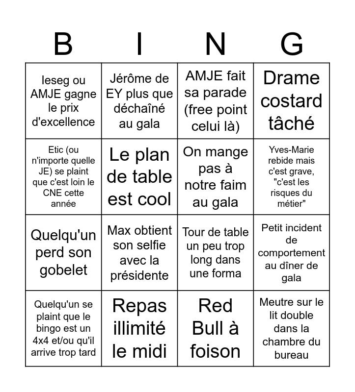 This bingo card has 16 words: Repas illimité le midi, Petit incident de comportement au dîner de gala, AMJE fait sa parade (free point celui là), Ieseg ou AMJE gagne le prix d'excellence, Quelqu'un perd son gobelet, Jérôme de EY plus que déchaîné au gala, Tour de table un peu trop long dans une forma, Red Bull à foison, Etic (ou n'importe quelle JE) se plaint que c'est loin le CNE cette année, Le plan de table est cool, Quelqu'un se plaint que le bingo est un 4x4 et/ou qu'il arrive trop tard, Drame costard tâché, Max obtient son selfie avec la présidente, Yves-Marie rebide mais c'est grave, "c'est les risques du métier", On mange pas à notre faim au gala and Meutre sur le lit double dans la chambre du bureau.