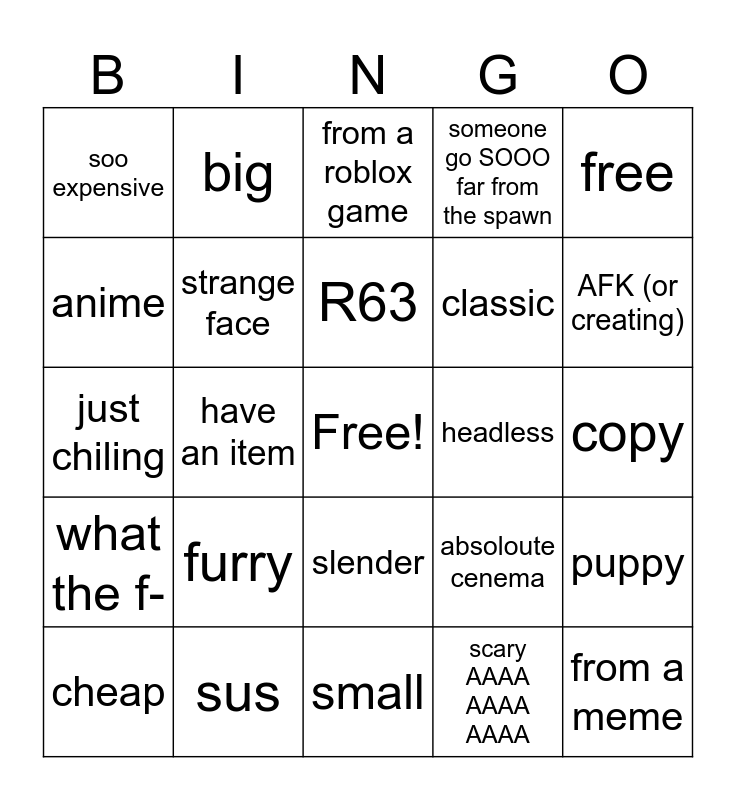 This bingo card has a free space and 24 words: furry, sus, R63, cheap, free, soo expensive, anime, big, headless, slender, classic, just chiling, absoloute cenema, puppy, strange face, scary AAAA AAAA AAAA, copy, from a roblox game, AFK (or creating), have an item, from a meme, what the f-, someone go SOOO far from the spawn and small.