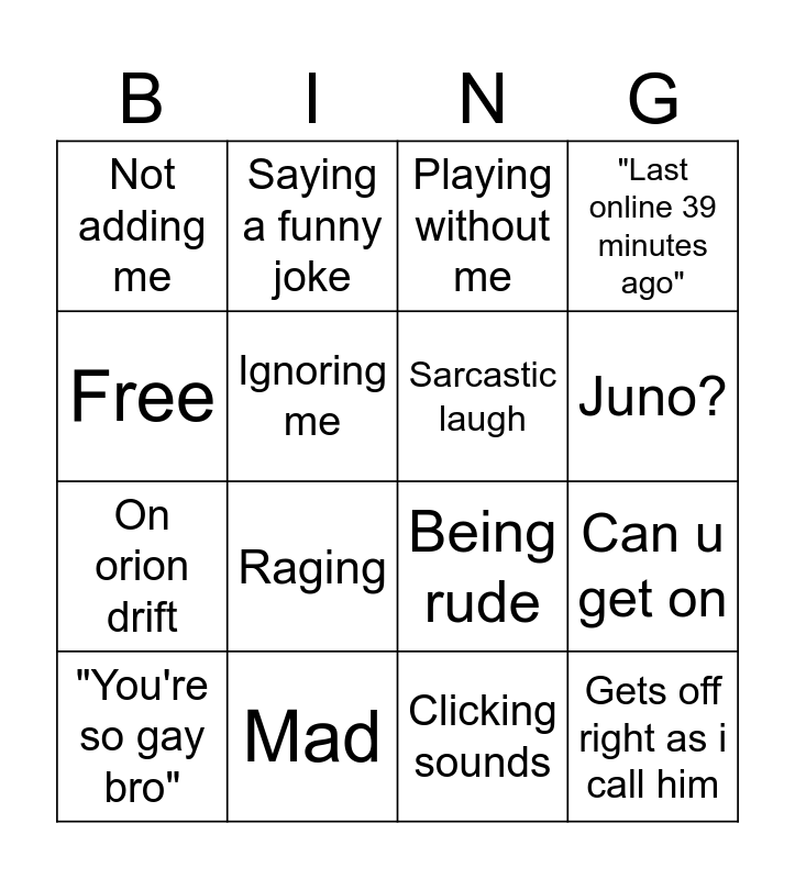 This bingo card has 16 words: Mad, Can u get on, Playing without me, Not adding me, On orion drift, Saying a funny joke, Being rude, Clicking sounds, Free, Ignoring me, "You're so gay bro", "Last online 39 minutes ago", Raging, Juno?, Sarcastic laugh and Gets off right as i call him.