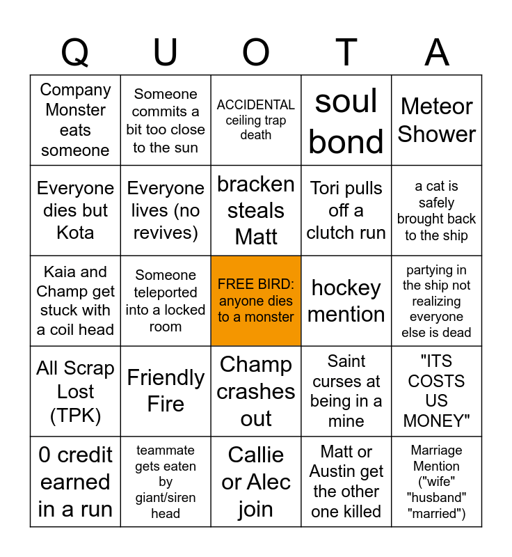 This bingo card has a free space and 46 words: Champ rolls dice and someone dies because of it, Marriage Mention ("wife" "husband" "married"), Saint kills a monster, Callie or Alec join, Friendly Fire, Fire exits are right next to each other, Someone commits a bit too close to the sun, "all bad", Everyone dies but Kota, someone gets left behind, Everyone lives (no revives), soul bond, "ITS COSTS US MONEY", Saint curses at being in a mine, Someone runs into their own mimic, someone besides Champ rolls dice, bracken steals Matt, hockey mention, Dog gets inside the ship, Meteor Shower, Someone teleported into a locked room, Matt or Austin get the other one killed, Company Monster eats someone, Tori pulls off a clutch run, kota dies (no longer rare occurrence), a cat is safely brought back to the ship, 0 credit earned in a run, Apparatus brought back successfully, Champ crashes out, All Scrap Lost (TPK), 1000 credit run, Anvil brought back successfully, a single event/monster kills 3+ people, Bee Hives brought back successfully, in-ship court proceeding, teammate gets eaten by giant/siren head, partying in the ship not realizing everyone else is dead, taking the apparatus while people are still inside, JUMP IN THE PIT, dying within the first 2 minutes of landing, LADS mention, ACCIDENTAL ceiling trap death, Kaia and Champ get stuck with a coil head, 3 or more snails at once, a single mom who works two jobs (baby monster) and someone waits a long time for Kota to TP them.