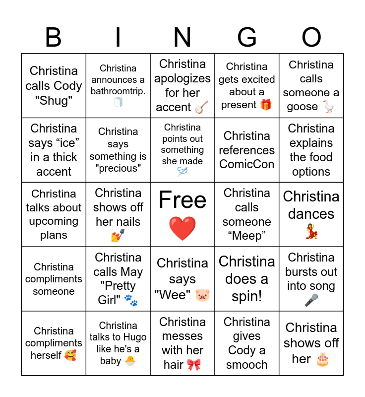 This bingo card has a free space and 24 words: Christina calls May "Pretty Girl" 🐾, Christina talks to Hugo like he's a baby 🐣, Christina points out something she made 🪡, Christina compliments herself 🥰, Christina calls someone a goose 🪿, Christina calls Cody "Shug", Christina says “ice” in a thick accent, Christina announces a bathroomtrip. 🧻, Christina calls someone “Meep”, Christina says "Wee" 🐷, Christina references ComicCon, Christina talks about upcoming plans, Christina does a spin!, Christina bursts out into song 🎤, Christina says something is "precious", Christina gives Cody a smooch, Christina dances 💃, Christina apologizes for her accent 🪕, Christina explains the food options, Christina shows off her nails 💅, Christina shows off her 🎂, Christina compliments someone, Christina gets excited about a present 🎁 and Christina messes with her hair 🎀.