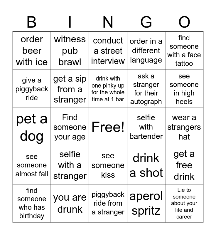 This bingo card has a free space and 24 words: selfie with a stranger, you are drunk, drink with one pinky up for the whole time at 1 bar, find someone who has birthday, find someone with a face tattoo, order beer with ice, give a piggyback ride, witness pub brawl, selfie with bartender, see someone kiss, ask a stranger for their autograph, pet a dog, drink a shot, get a free drink, get a sip from a stranger, aperol spritz, wear a strangers hat, conduct a street interview, see someone in high heels, Find someone your age, Lie to someone about your life and career, see someone almost fall, order in a different language and piggyback ride from a stranger.