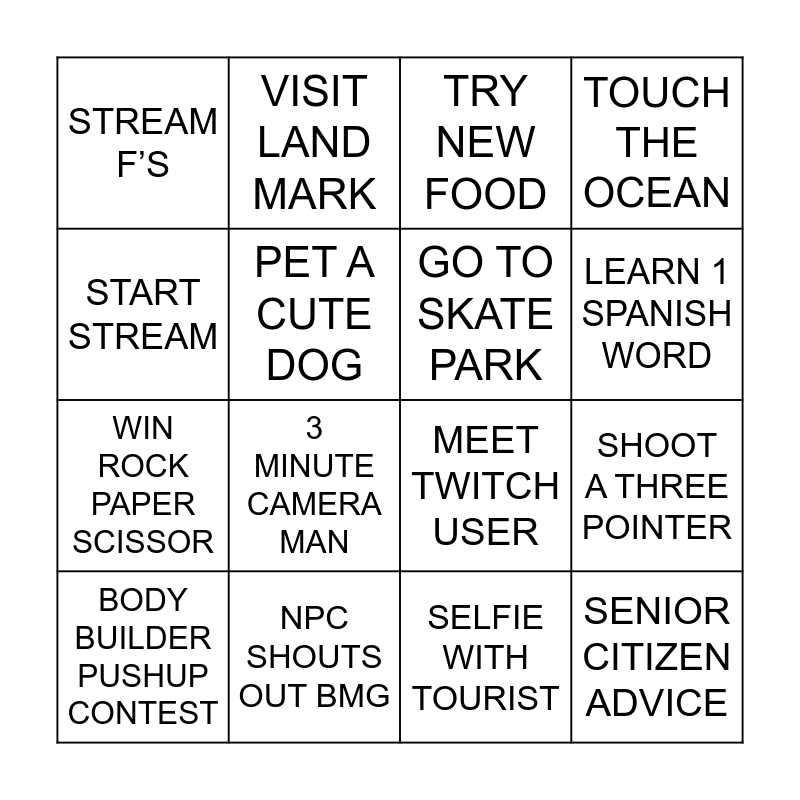 This bingo card has 16 words: NPC SHOUTS OUT BMG, SHOOT A THREE POINTER, TRY NEW FOOD, STREAM F’S, WIN ROCK PAPER SCISSOR, VISIT LAND MARK, MEET TWITCH USER, SELFIE WITH TOURIST, START STREAM, PET A CUTE DOG, BODY BUILDER PUSHUP CONTEST, TOUCH THE OCEAN, 3 MINUTE CAMERA MAN, LEARN 1 SPANISH WORD, GO TO SKATE PARK and SENIOR CITIZEN ADVICE.