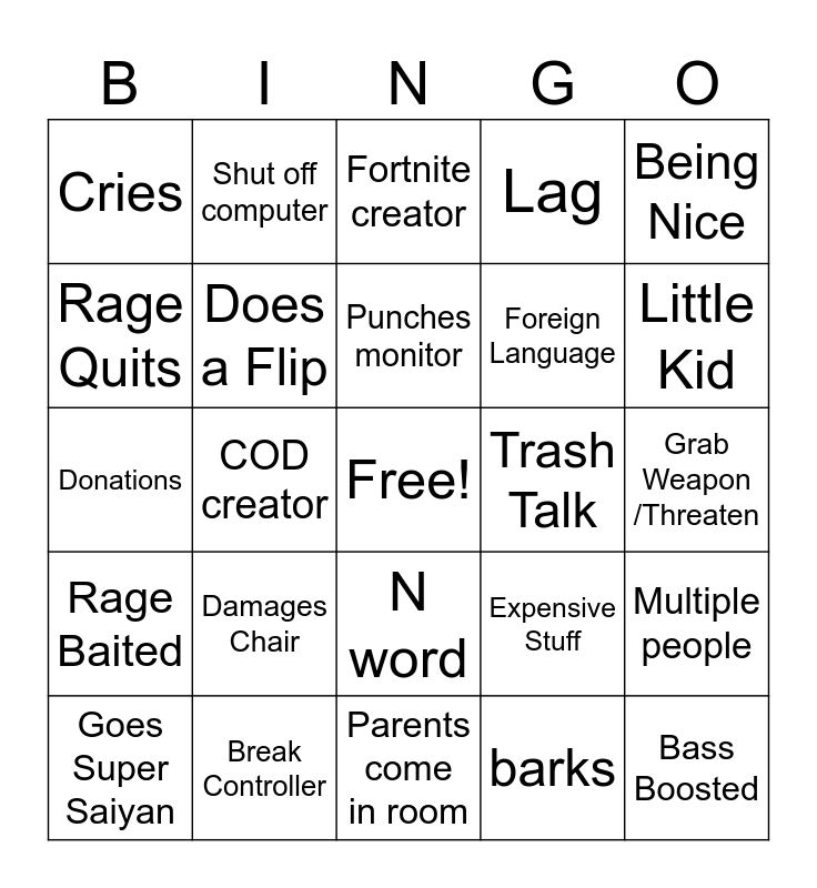 This bingo card has a free space and 24 words: Damages Chair, Break Controller, Punches monitor, Goes Super Saiyan, Being Nice, Cries, Rage Quits, Shut off computer, Trash Talk, N word, Foreign Language, Donations, Expensive Stuff, Multiple people, Does a Flip, barks, Grab Weapon /Threaten, Fortnite creator, Little Kid, COD creator, Bass Boosted, Rage Baited, Lag and Parents come in room.