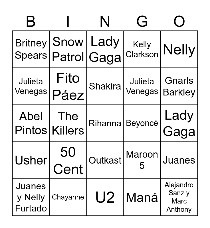 This bingo card has 40 words: Diego Torres, Abel Pintos, Coti, Fito Páez, Chayanne, Outkast, Shakira, Beyoncé, Nelly, Usher, The Killers, Kelly Clarkson, Rihanna, Lady Gaga, Beyoncé, 50 Cent, Green Day, Britney Spears, Adele, Lady Gaga, Juanes, Maná, Julieta Venegas, Julieta Venegas, Shakira, David Bisbal, Belinda, Camila, Alejandro Sanz y Marc Anthony, Aventura, Gusttavo Lima, Juanes y Nelly Furtado, Shakira y Alejandro Sanz, Maroon 5, Gnarls Barkley, U2, Christina Aguilera, Aventura, Snow Patrol and Vanessa Carlton.