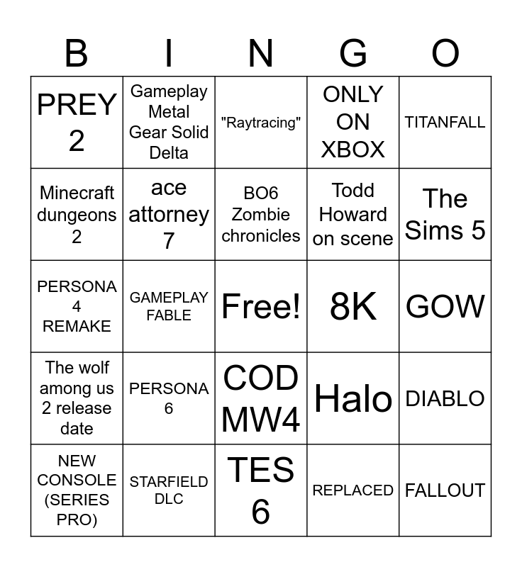 This bingo card has a free space and 24 words: PERSONA 6, STARFIELD DLC, BO6 Zombie chronicles, NEW CONSOLE (SERIES PRO), TITANFALL, PREY 2, Minecraft dungeons 2, Gameplay Metal Gear Solid Delta, 8K, COD MW4, Todd Howard on scene, PERSONA 4 REMAKE, Halo, DIABLO, ace attorney 7, REPLACED, GOW, "Raytracing", The Sims 5, GAMEPLAY FABLE, FALLOUT, The wolf among us 2 release date, ONLY ON XBOX and TES 6.