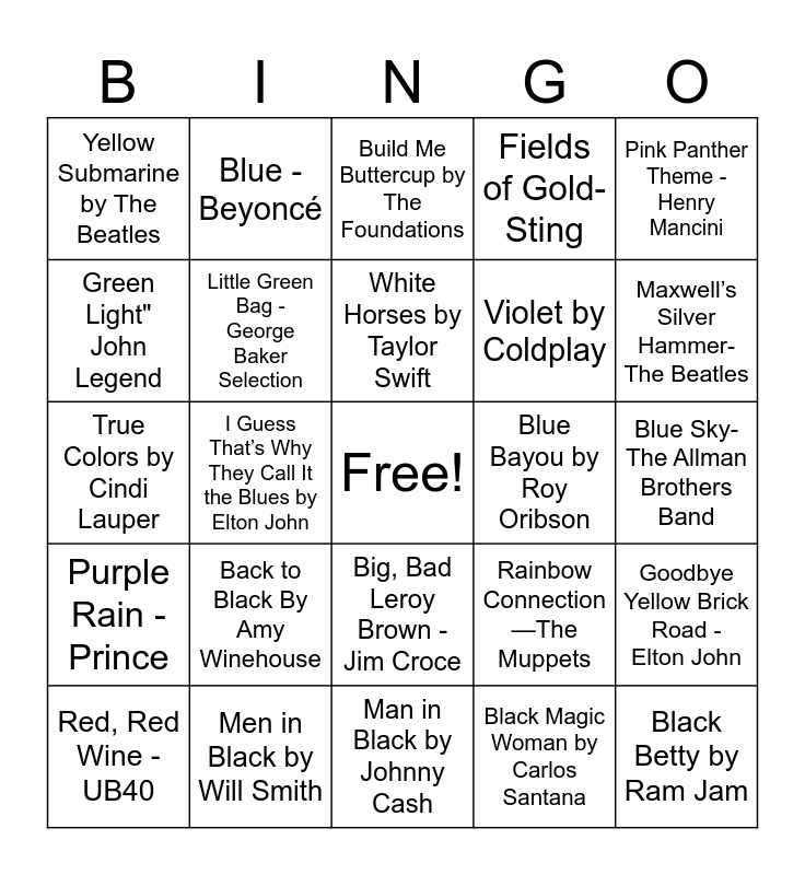 This bingo card has a free space and 25 words: Back to Black By Amy Winehouse, Man in Black by Johnny Cash, White Horses by Taylor Swift, Red, Red Wine - UB40, Pink Panther Theme - Henry Mancini, Yellow Submarine by The Beatles, Green Light" John Legend, Blue - Beyoncé, Blue Bayou by Roy Oribson, Big, Bad Leroy Brown - Jim Croce, Violet by Coldplay, True Colors by Cindi Lauper, Rainbow Connection —The Muppets, Goodbye Yellow Brick Road - Elton John, Little Green Bag - George Baker Selection, Pink - Aerosmith, Blue Sky- The Allman Brothers Band, Build Me Buttercup by The Foundations, Maxwell’s Silver Hammer- The Beatles, I Guess That’s Why They Call It the Blues by Elton John, Black Betty by Ram Jam, Men in Black by Will Smith, Purple Rain - Prince, Fields of Gold- Sting and Black Magic Woman by Carlos Santana.