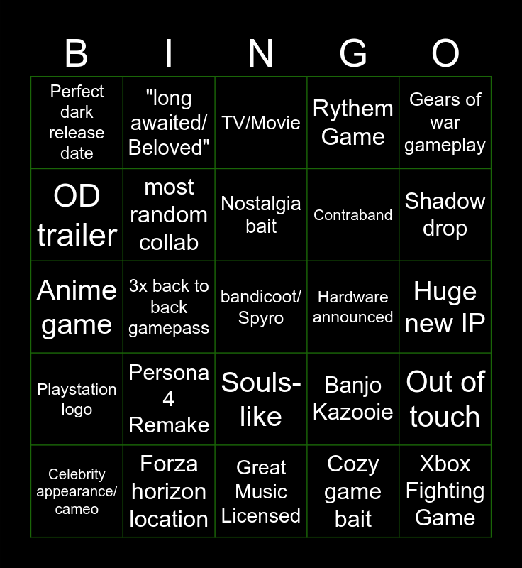 This bingo card has a free space and 24 words: Persona 4 Remake, Forza horizon location, Nostalgia bait, Celebrity appearance/ cameo, Gears of war gameplay, Perfect dark release date, OD trailer, "long awaited/ Beloved", Hardware announced, Souls-like, Contraband, Anime game, Banjo Kazooie, Out of touch, most random collab, Cozy game bait, Huge new IP, TV/Movie, Shadow drop, 3x back to back gamepass, Xbox Fighting Game, Playstation logo, Rythem Game and Great Music Licensed.