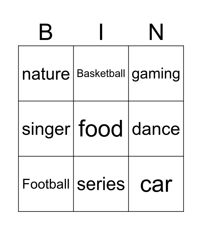 This bingo card has a free space and 8 words: dance, gaming, Basketball, Football, nature, car, singer and series.