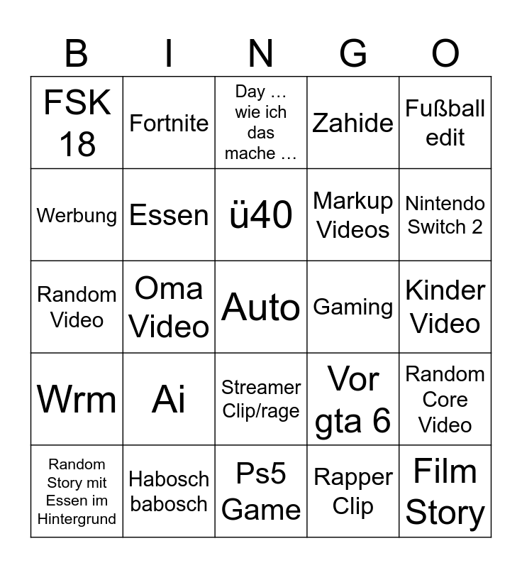 This bingo card has a free space and 24 words: Ai, Habosch babosch, ü40, Random Story mit Essen im Hintergrund, Fußball edit, FSK 18, Werbung, Fortnite, Gaming, Streamer Clip/rage, Markup Videos, Random Video, Vor gta 6, Random Core Video, Essen, Rapper Clip, Kinder Video, Day … wie ich das mache …, Nintendo Switch 2, Oma Video, Film Story, Wrm, Zahide and Ps5 Game.