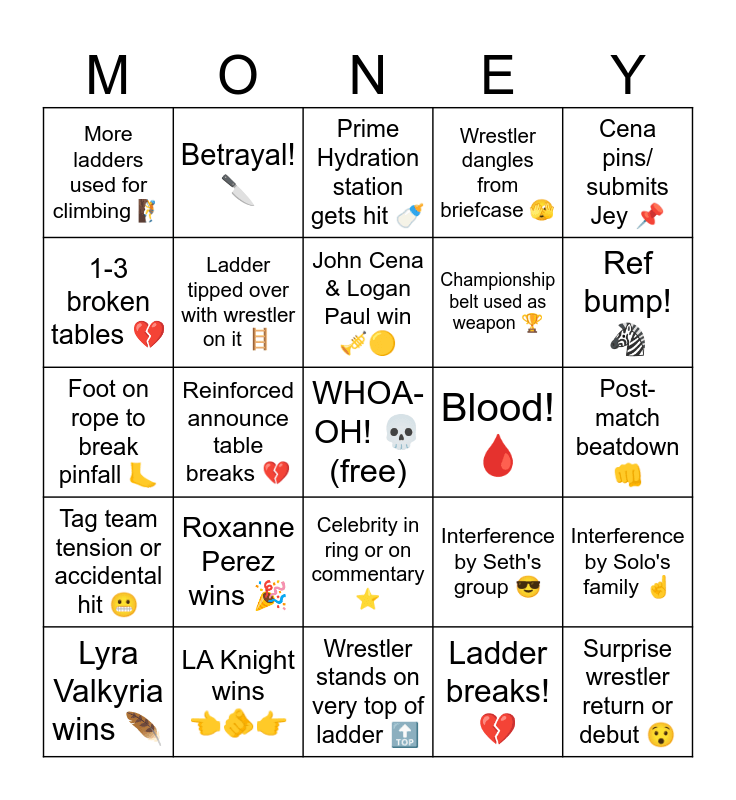 This bingo card has a free space and 24 words: Roxanne Perez wins π, LA Knight wins ππ«΅π, John Cena & Logan Paul win πΊπ‘, Lyra Valkyria wins πͺΆ, Cena pins/ submits Jey π, More ladders used for climbing π§, 1-3 broken tables π, Betrayal! πͺ, Blood! π©Έ, Celebrity in ring or on commentary β, Championship belt used as weapon π, Foot on rope to break pinfall π¦Ά, Interference by Seth's group π, Interference by Solo's family βοΈ, Ladder tipped over with wrestler on it πͺ, Ladder breaks! π, Post-match beatdown π, Prime Hydration station gets hit πΌ, Ref bump! π¦, Reinforced announce table breaks π, Surprise wrestler return or debut π―, Tag team tension or accidental hit π¬, Wrestler dangles from briefcase π«£ and Wrestler stands on very top of ladder π.