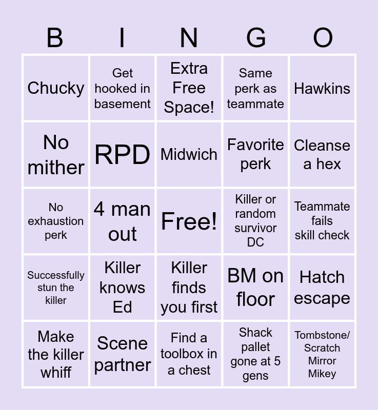 This bingo card has a free space and 61 words: Killer or random survivor is a ttv, Scene partner, Pebble, Successfully stun the killer, Shack pallet gone at 5 gens, <2% Pick rate killer, RPD, "Meta" perk, Favorite perk, 2 Perks from the same character, Same perk as teammate, Same perk 2x in a row, No mither, Conflicting perks, Value from perk, Chucky, Tombstone/ Scratch Mirror Mikey, Hawkins, Killer gives up chase, Midwich, Killer or random survivor DC, Extra Free Space!, Make the killer whiff, Hatch escape, Get slugged, Get facecamped, Get tunneled, Legion, Cleanse a hex, Escape on death hook, Successful hook sabotage, Successful killer grasp rescue, Killer or random survivor brings map, Unhook self, Get hooked in basement, Invocation, First one to die, 4 man out, Die from entity (end game collapse), No exhaustion perk, Friendly killer, Killer knows Ed, Teammate fails skill check, Hit on hook, BM on floor, Same killer 2x in a row, Get 4 iri emblems, Slug race, Get moried, Killer finds you first, Find a toolbox in a chest, Die after gates are opened, Dead hard, Stealth killer, Killer has a lullaby, Hit second stage on 1st hook, Successful hide in locker, 3+ people slugged at once, Killer is P10+, Perk from survivor you're playing and Lightborn.