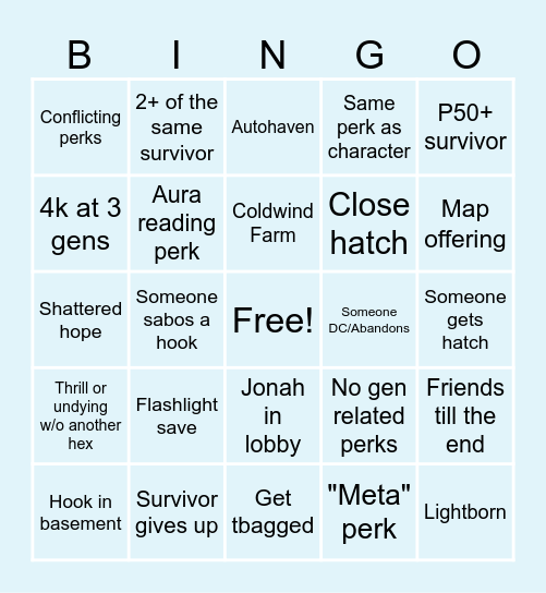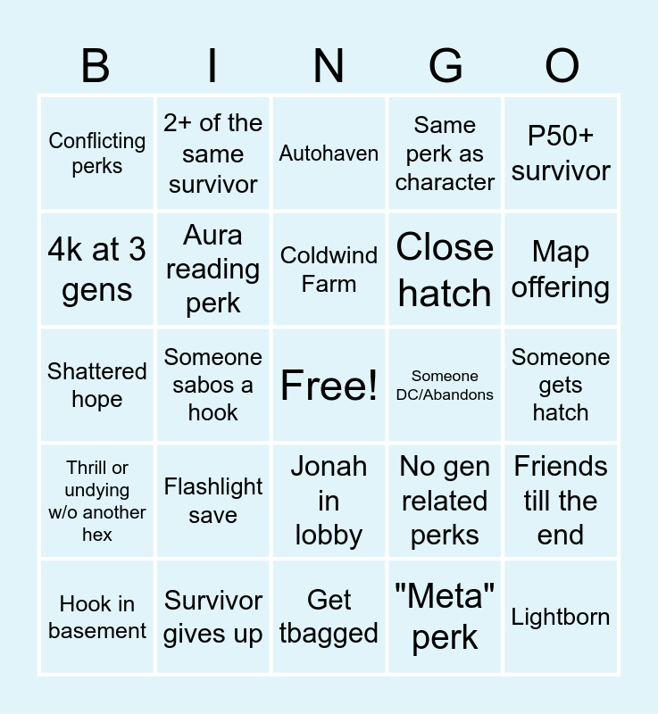 This bingo card has a free space and 34 words: Extra free space!, "Meta" perk, Someone cleanses hex, TTV in lobby, Thrill or undying w/o another hex, Aura reading perk, P50+ survivor, Hook in basement, 2+ of the same survivor, Scourge hook, Coldwind Farm, Autohaven, 4k, Everyone escapes, Someone DC/Abandons, Map offering, Survivor gives up, Shattered hope, Flashlight save, No gen related perks, Jonah in lobby, Silly steam name, Conflicting perks, Someone gets hatch, Get tbagged, Lightborn, Same perk as character, Get endgame mori, Close hatch, 4k at 3 gens, Down a survivor while carrying one, Someone sabos a hook, Friends till the end and 4 Iri emblems.