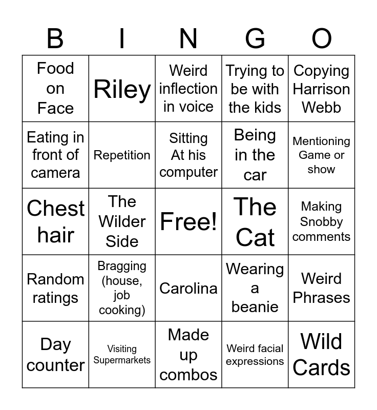 This bingo card has a free space and 24 words: Bragging (house, job cooking), Visiting Supermarkets, Sitting At his computer, Day counter, Copying Harrison Webb, Food on Face, Eating in front of camera, Riley, The Cat, Carolina, Being in the car, Chest hair, Wearing a beanie, Weird Phrases, Repetition, Weird facial expressions, Making Snobby comments, Weird inflection in voice, Mentioning Game or show, The Wilder Side, Wild Cards, Random ratings, Trying to be with the kids and Made up combos.