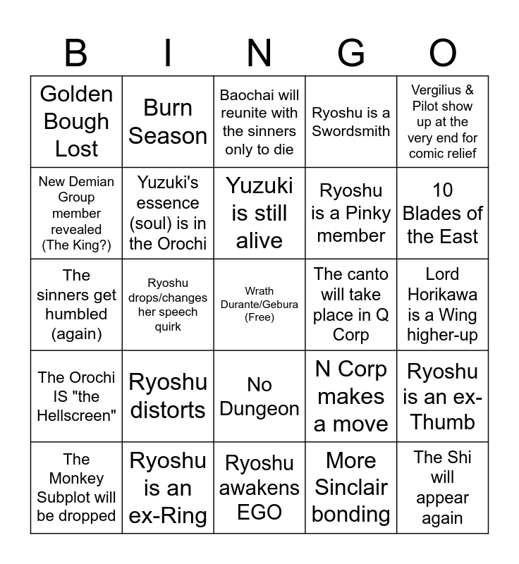 This bingo card has a free space and 24 words: Ryoshu distorts, Ryoshu is an ex-Ring, Yuzuki is still alive, The Monkey Subplot will be dropped, Vergilius & Pilot show up at the very end for comic relief, Golden Bough Lost, New Demian Group member revealed (The King?), Burn Season, The canto will take place in Q Corp, No Dungeon, Ryoshu is a Pinky member, The sinners get humbled (again), N Corp makes a move, Ryoshu is an ex-Thumb, Yuzuki's essence (soul) is in the Orochi, More Sinclair bonding, Lord Horikawa is a Wing higher-up, Baochai will reunite with the sinners only to die, 10 Blades of the East, Ryoshu drops/changes her speech quirk, The Shi will appear again, The Orochi IS "the Hellscreen", Ryoshu is a Swordsmith and Ryoshu awakens EGO.