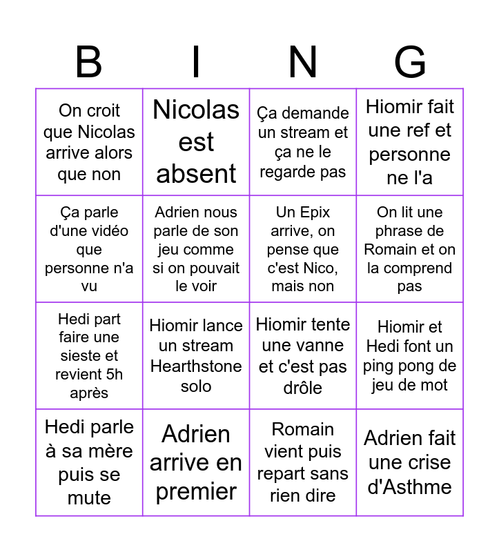 This bingo card has 16 words: Adrien arrive en premier, Hiomir et Hedi font un ping pong de jeu de mot, Ça demande un stream et ça ne le regarde pas, On croit que Nicolas arrive alors que non, Hedi part faire une sieste et revient 5h après, Nicolas est absent, Hiomir tente une vanne et c'est pas drôle, Romain vient puis repart sans rien dire, Ça parle d'une vidéo que personne n'a vu, Adrien nous parle de son jeu comme si on pouvait le voir, Hedi parle à sa mère puis se mute, Hiomir fait une ref et personne ne l'a, Hiomir lance un stream Hearthstone solo, On lit une phrase de Romain et on la comprend pas, Un Epix arrive, on pense que c'est Nico, mais non and Adrien fait une crise d'Asthme.