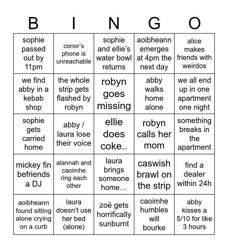 This bingo card has a free space and 24 words: alannah and caoimhe ring each other, laura doesn’t use her bed (alone), robyn goes missing, aoibheann found sitting alone crying on a curb, alice makes friends with weirdos, sophie passed out by 11pm, we find abby in a kebab shop, conor’s phone is unreachable, robyn calls her mom, laura brings someone home…, abby walks home alone, sophie gets carried home, caswish brawl on the strip, find a dealer within 24h, the whole strip gets flashed by robyn, caoimhe humbles will bourke, something breaks in the apartment, sophie and ellie’s water bowl returns, we all end up in one apartment one night, abby / laura lose their voice, abby kisses a 5/10 for like 3 hours, mickey fin befriends a DJ, aoibheann emerges at 4pm the next day and zoë gets horrifically sunburnt.