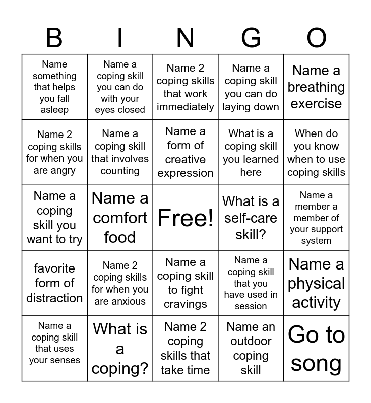 This bingo card has a free space and 24 words: Name 2 coping skills for when you are anxious, What is a coping?, Name a form of creative expression, Name a coping skill that uses your senses, Name a breathing exercise, Name something that helps you fall asleep, Name 2 coping skills for when you are angry, Name a coping skill you can do with your eyes closed, What is a self-care skill?, Name a coping skill to fight cravings, What is a coping skill you learned here, Name a coping skill you want to try, Name a coping skill that you have used in session, Name a physical activity, Name a coping skill that involves counting, Name an outdoor coping skill, Name a member a member of your support system, Name 2 coping skills that work immediately, When do you know when to use coping skills, Name a comfort food, Go to song, favorite form of distraction, Name a coping skill you can do laying down and Name 2 coping skills that take time.
