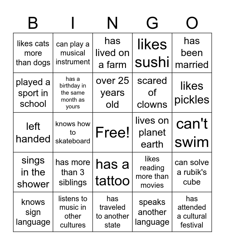 This bingo card has a free space and 24 words: has more than 3 siblings, listens to music in other cultures, over 25 years old, knows sign language, has been married, likes cats more than dogs, played a sport in school, can play a musical instrument, lives on planet earth, has a tattoo, scared of clowns, left handed, likes reading more than movies, can solve a rubik's cube, has a birthday in the same month as yours, speaks another language, can't swim, has lived on a farm, likes pickles, knows how to skateboard, has attended a cultural festival, sings in the shower, likes sushi and has traveled to another state.