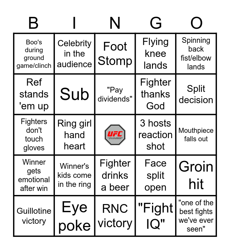 This bingo card has a free space and 49 words: Fighter sits on the bar, "one of the best fights we've ever seen", Unanimous decision, RNC victory, Winner's kids come in the ring, K.O, Celebrity in the audience, Buffer fist bumps fighter, Ref stands 'em up, „He is hurt“, Sub, Flying knee lands, Groin hit, Face split open, TKO, 1st round finish, "Pay dividends", 3 hosts reaction shot, Doctor stoppage, Spinning back fist/elbow lands, Ring girl hand heart, "Fight IQ", Boo's during ground game/clinch, Fighter thanks God, Significant Blood on the canvas, Split decision, Guillotine victory, Armbar/ kneebar victory, Fighter drinks a beer, Winner gets emotional after win, Fighter gets slammed, "He had a tough training camp", "That's deep", Corner coach uses vulgarity, Eye poke, commentator desk has insane reaction, Fighter has one eye swollen shut, Fighter cusses in post fight interview, Mouthpiece falls out, Fighter asks for title shot, Camera pans away from Megan Olivi, Fighter complains about stoppage, Fence grab, Ref deducts a point, Fighters don't touch gloves, Foot Stomp, Clash of Heads, Johnny Walker geht schlafen and 5 ko‘s.