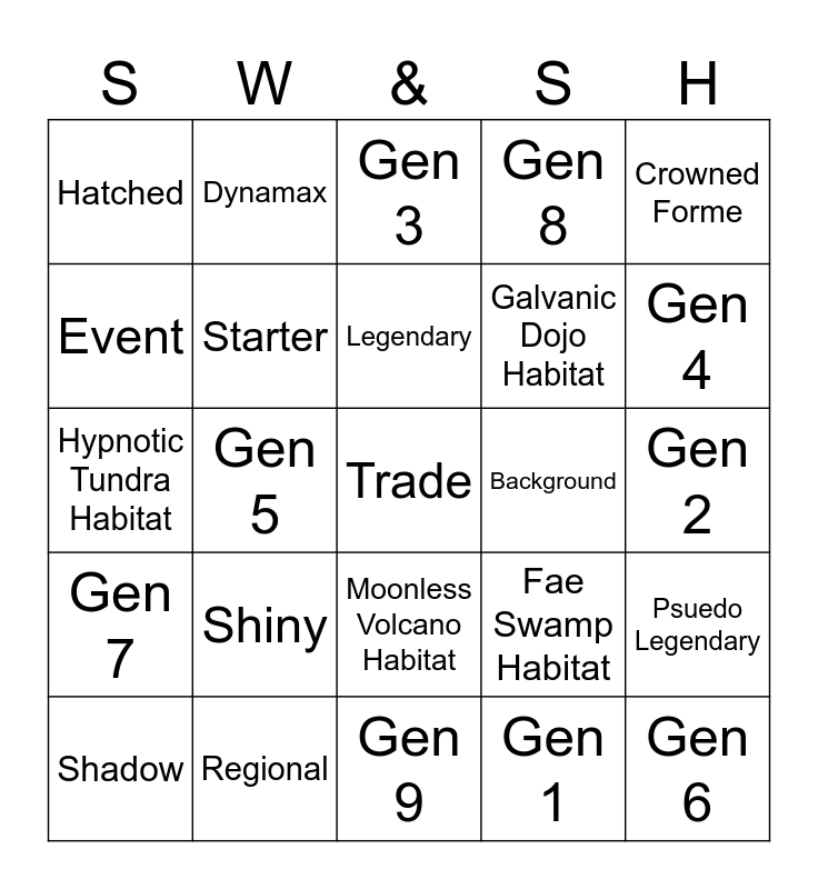 This bingo card has a free space and 24 words: Shiny, Regional, Legendary, Shadow, Crowned Forme, Hatched, Event, Dynamax, Background, Moonless Volcano Habitat, Galvanic Dojo Habitat, Hypnotic Tundra Habitat, Fae Swamp Habitat, Psuedo Legendary, Starter, Gen 1, Gen 2, Gen 3, Gen 4, Gen 5, Gen 6, Gen 7, Gen 8 and Gen 9.