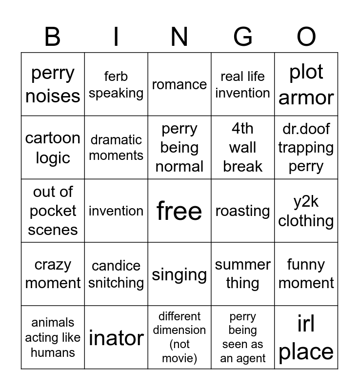 This bingo card has a free space and 24 words: candice snitching, inator, perry being normal, animals acting like humans, plot armor, perry noises, cartoon logic, ferb speaking, roasting, singing, 4th wall break, out of pocket scenes, summer thing, funny moment, dramatic moments, perry being seen as an agent, y2k clothing, romance, dr.doof trapping perry, invention, irl place, crazy moment, real life invention and different dimension (not movie).