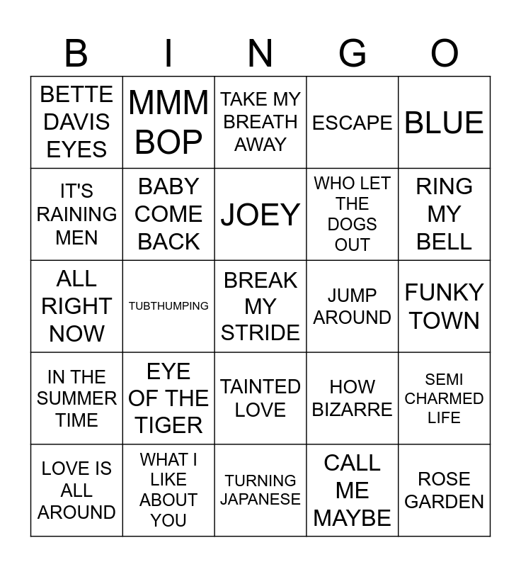 This bingo card has 30 words: WHAT I LIKE ABOUT YOU, THE BOYS ARE BACK IN TOWN, TUBTHUMPING, EASY LOVER, BETTE DAVIS EYES, TAKE MY BREATH AWAY, BABY COME BACK, TAINTED LOVE, JUMP AROUND, TURNING JAPANESE, FUNKY TOWN, BREAK MY STRIDE, CALL ME MAYBE, ROSE GARDEN, RING MY BELL, BREAKFAST AT TIFFANYS, HOW BIZARRE, IN THE SUMMER TIME, EYE OF THE TIGER, BLUE, ALL RIGHT NOW, OUR HOUSE, MMM BOP, WHO LET THE DOGS OUT, IT'S RAINING MEN, ESCAPE, SEMI CHARMED LIFE, LOVE IS ALL AROUND, JOEY and KUNG FU FIGHTING.