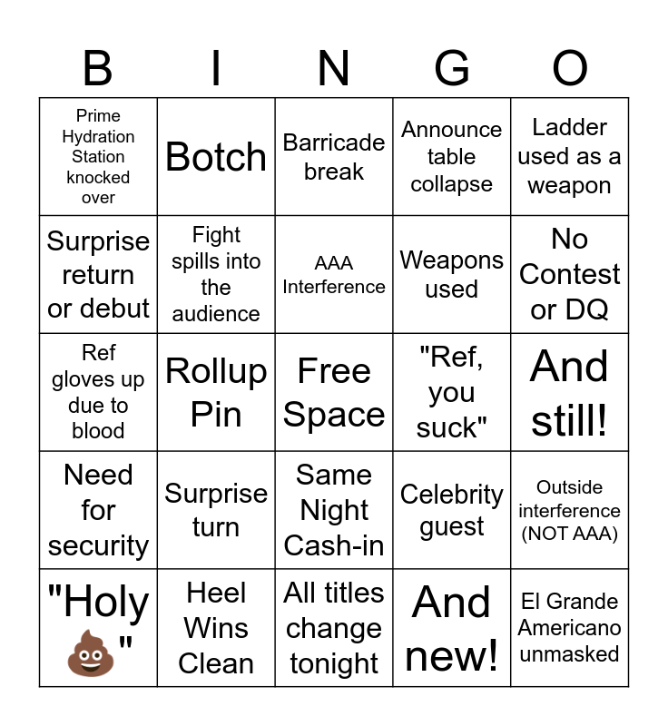 This bingo card has a free space and 26 words: Same Night Cash-in, And new!, AAA Interference, Heel Wins Clean, Ladder used as a weapon, Prime Hydration Station knocked over, Surprise return or debut, Botch, And still!, Celebrity guest, Weapons used, Ref gloves up due to blood, Outside interference (NOT AAA), "Holy 💩", Rollup Pin, "This is awesome", Announce table collapse, Need for security, Barricade break, El Grande Americano unmasked, No Contest or DQ, All titles change tonight, "Ref, you suck", Surprise turn, Fight spills into the audience and Intense stare-down before brawl.