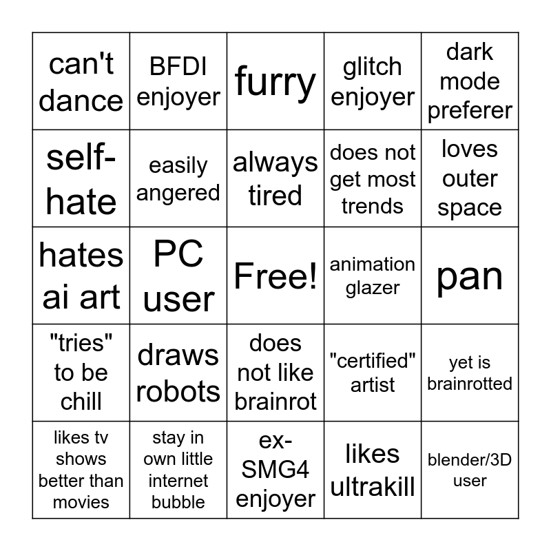 This bingo card has a free space and 24 words: draws robots, stay in own little internet bubble, always tired, likes tv shows better than movies, dark mode preferer, can't dance, self-hate, BFDI enjoyer, animation glazer, does not like brainrot, does not get most trends, hates ai art, "certified" artist, yet is brainrotted, easily angered, likes ultrakill, pan, furry, loves outer space, PC user, blender/3D user, "tries" to be chill, glitch enjoyer and ex-SMG4 enjoyer.