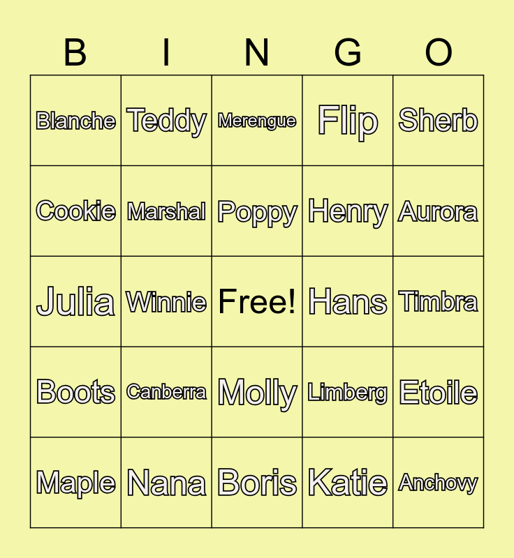 This bingo card has a free space and 24 words: Canberra, Nana, Poppy, Maple, Sherb, Blanche, Cookie, Teddy, Hans, Molly, Henry, Julia, Limberg, Etoile, Marshal, Katie, Timbra, Merengue, Aurora, Winnie, Anchovy, Boots, Flip and Boris.