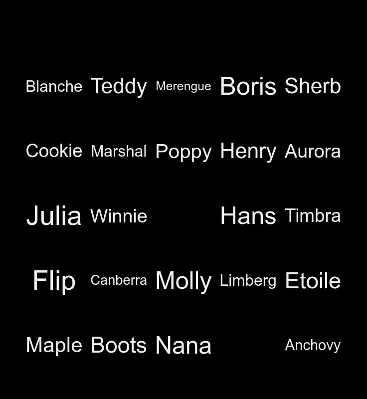 This bingo card has a free space and 25 words: Canberra, Nana, Poppy, Maple, Sherb, Blanche, Cookie, Teddy, Hans, Molly, Henry, Julia, Limberg, Etoile, Marshal, Katie, Timbra, Merengue, Aurora, Winnie, Anchovy, Boots, Flip, Boris and Warthog.