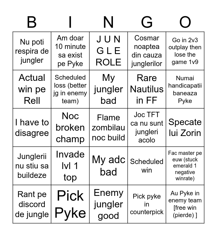 This bingo card has a free space and 24 words: Invade lvl 1 top, Pick Pyke, My jungler bad, Rant pe discord de jungle, Go in 2v3 outplay then lose the game 1v9, Nu poti respira de jungler, Actual win pe Rell, Am doar 10 minute sa exist pe Pyke, Joc TFT ca nu sunt jungleri acolo, My adc bad, Rare Nautilus in FF, I have to disagree, Scheduled win, Fac master pe euw (stuck emerald 1 negative winrate), Scheduled loss (better jg in enemy team), Pick pyke in counterpick, Specate lui Zorin, J U N G L E ROLE, Numai handicapatii baneaza Pyke, Noc broken champ, Au Pyke in enemy team [free win (pierde) ], Junglerii nu stiu sa buildeze, Cosmar noaptea din cauza junglerilor and Enemy jungler good.