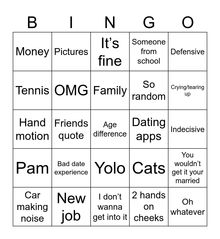 This bingo card has a free space and 36 words: Free!, Ex Bf, Pro Sports, OMG, Cats, Pam, Family, Cody/denver, Defensive, History, Friends quote, Someone from school, Moving, Dating apps, Crying/tearing up, Money, Full / too much food, Bad date experience, Oh whatever, It’s fine, Indecisive, You wouldn’t get it your married, New job, Car making noise, I don’t wanna get into it, Pictures, Hand motion, Melissa segal, So random, Tennis, Scoffing, Wtf, 2 hands on cheeks, Yolo, Don’t say anything and Truth or spicy truth.