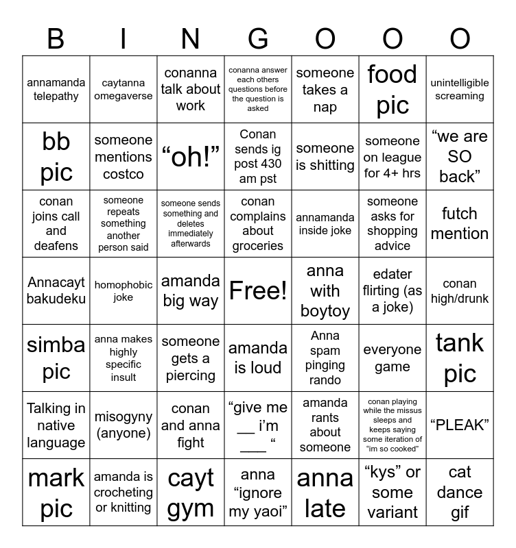 This bingo card has a free space and 91 words: gelo with archie, anna late, conan complains about groceries, cayt barks, amanda tft, sil/brother are stupid, amanda is crocheting or knitting, simba pic, mark pic, vivian barges into amanda's room, gelo ranked, gelo high/drunk, amanda is loud, conan joins call and deafens, caytgeloanna f slur, bb pic, conan high/drunk, tank pic, anna leaves call for boytoy, conan and anna fight, conan playing while the missus sleeps and keeps saying some iteration of “im so cooked”, misogyny (anyone), homophobic joke, Gumagelo, Conan sends ig post 430 am pst, Annacayt bakudeku, t1 crashout, anna makes highly specific insult, medical advice from conancayt, someone gets a tattoo, someone gets a piercing, someone asks for shopping advice, “give me __ i’m ___ “, someone repeats something another person said, annamanda telepathy, conanna answer each others questions before the question is asked, conanna talk about work, @bbtruthers when someone is on transit, someone is shitting, “oh!”, futch mention, food pic, Anna spam pinging rando, Talking in native language, “PLEAK”, annamanda inside joke, gelo volleyball, cayt gym, conan gym, amanda rants about someone, cayt cooking (literal), someone mentions costco, fit pic, @bbtruthers and no one responds, fatal typo, “welcome back…” joke, “we are SO back”, “kys” or some variant, 5+ billboard entries in one day, everyone game, anna with boytoy, cayt with nick, conan with jessica, financial irresponsibility, fashion advice, someone buys boba, someone buys coffee, amanda big way, “fujo out” or some variant, conan asks gaming then ghosts, someone sends something and deletes immediately afterwards, someone on league for 4+ hrs, edater flirting (as a joke), anna “ignore my yaoi”, caytanna omegaverse, unintelligible screaming, racism, esports player crashout (not t1), variant of cooked/cooking, “this MIGHT be…”, cat dance gif, someone takes a nap, gelocayt telepathy, amanda says bbygirl (or variant), ate (figuratively), conanna telepathy, league at ungodly hour (before 9am est or pst), amanda love and deepspace crashout, league before 9am pst, someone crashes out abt work and anna on time.