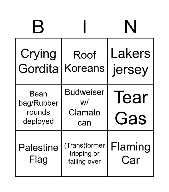 This bingo card has 9 words: Palestine Flag, Lakers jersey, Roof Koreans, Bean bag/Rubber rounds deployed, Crying Gordita, Tear Gas, Budweiser w/ Clamato can, Flaming Car and (Trans)former tripping or falling over.